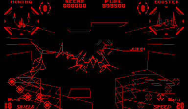 Despite this, the game soldiers along at a pretty solid frame rate, especially by the standards of the time. This is aided by its wireframe aesthetic, of course, but also other graphical compromises. The draw distance is quite short, and all of the levels are essentially tunnels. Although it can at times look goofy, the game wisely draws enemies earlier the environment surrounding them. Additionally, unlike most shoot ’em ups, contact with the ground or walls does not inflict damage. I found the 3D space surprisingly parsable most of the time (even communicating themes and environmental character surprisingly well), but I won’t deny it took a bit of getting used to, so the collision lenience helped. All of these little decisions are smart and show a nice intentionality of design. They worked with the hardware they had.